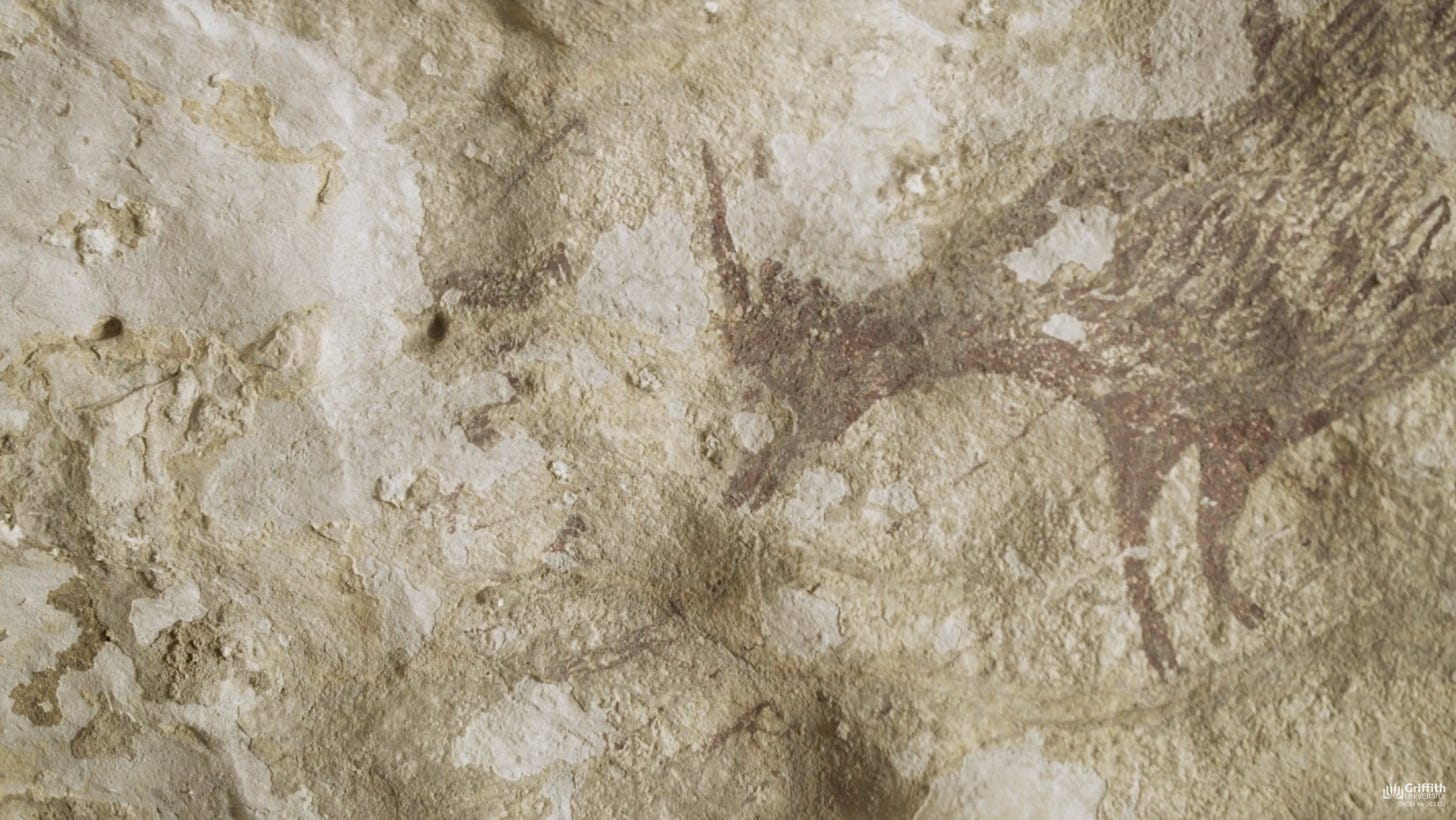 43,900-year-old cave painting found at the Leang Bulu’ Sipong 4 site in South Sulawesi, Indonesia. (Griffith University)